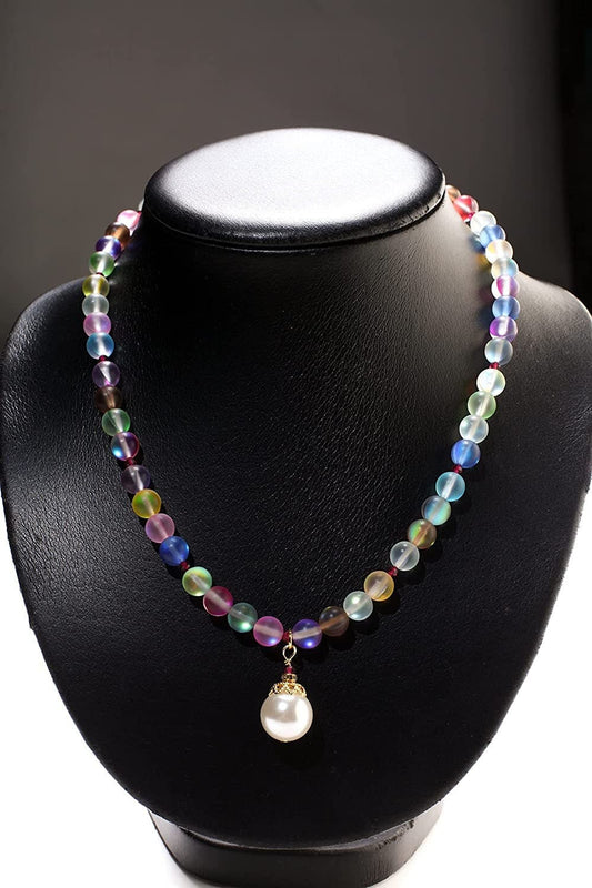 Mattes mehrfarbiges Seeglas, Meerjungfrauenperle, Anhänger aus weißen Südseeperlen, facettierte rote Spinell-Abstandshalterkette plus 2"-Verlängerung