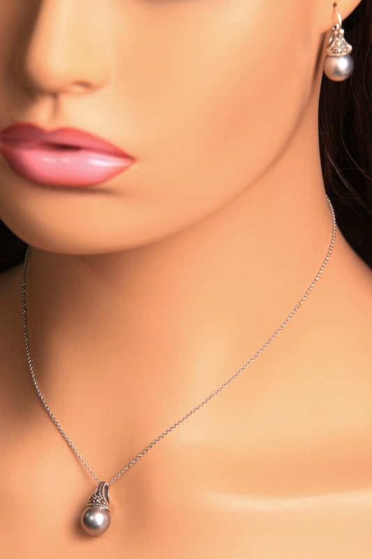 925 Sterling Silber Markasit mit Perle 10mm Anhänger, Ohrringe Set, Sterling Silber Kabelkette Halskette Schmuckset, 925 gestempelt