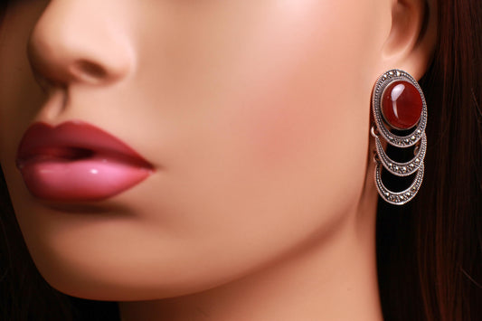 Vintage Markasit 925 Sterling Silber 16mm Karneol, baumelnde bewegliche Creolen, Einzelstück Markasit Edelstein Ohrringe