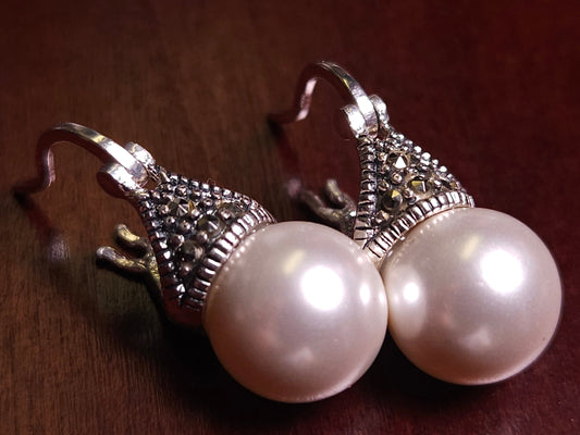 Vintage Markasit mit Perle 12 mm 925 Sterling Silber Huggie Creolen. Vintage antikes Geschenk für sie. 925 gestempelt