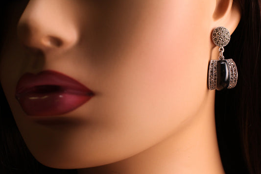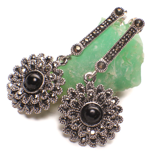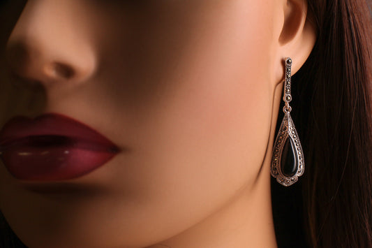 Markasit 925 Sterling Silber Ohrstecker, Tropfen Ohrhänger Schwarzer Onyx, Vintage, Antike Markasit Ohrringe Geschenk für Sie