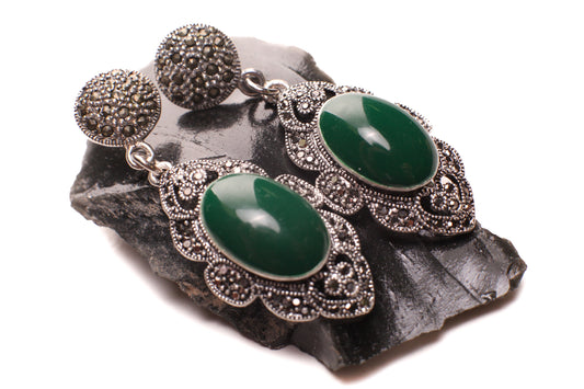 Vintage Markasit 925 Sterling Silber, grüner Onyx 28x48mm Tropfenohrringe. 925 gestempelt, Antikes Vintage Geschenk für Sie