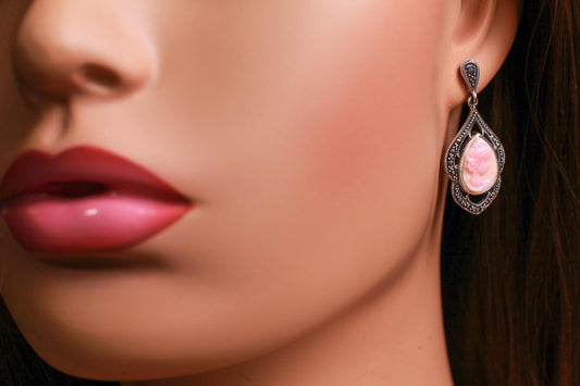Vintage Markasit Kamee rosa Muschel handpflegend, 925 Sterling Silber Ohrstecker, 925 gestempelt, Antik Vintage, Geschenk