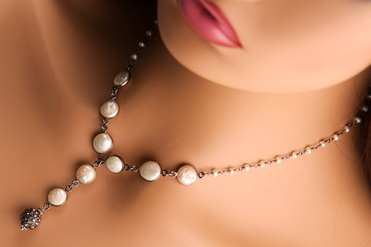 Natürliche Süßwasser-Münzperle, oxidierte silberne Lünettenkette, Akzent mit Markasit-Kugel in Lariat-Choker-Drahtwickel-Perlenkette, Y-Halskette