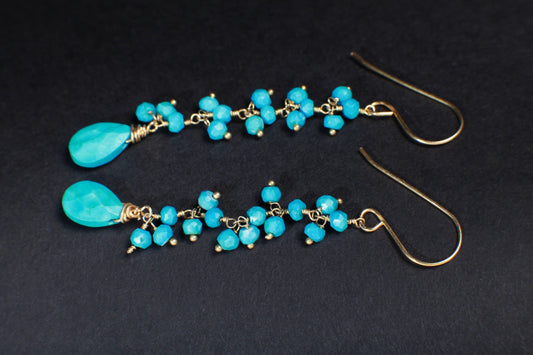 Echter, mit Draht umwickelter, blauer Türkis-Ohrring in Form einer Dornröschen-Tropfenform, langer, vergoldeter Ohrring.