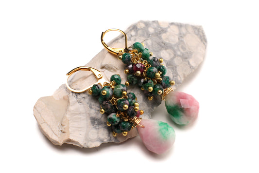 Natürliche Rubin-Zoisit-Cluster mit Drahtwicklung, dreifarbige Candy-Jade-Briolette in facettierten Tropfenform, vergoldet oder mit 14 Karat Gold gefüllt, mit Leverback