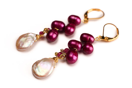 Süßwasserperlen-Kaskaden-Ohrringe, baumelnde, handgefertigte Goldohrringe, pfirsichrosa 12-mm-Münzperle, himbeerrote Perle, roter Spinell-Spacer