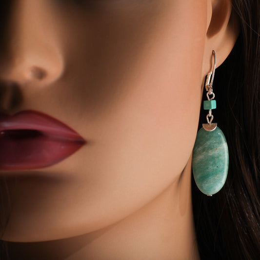 Natürliche Amazonit-Ohrringe, lange ovale Ohrringe mit Akzenten in türkisfarbenem Würfel, silberner Leverback