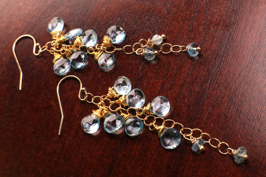 Echte Schweizer Blautopas 6–7 mm facettierte Herz-Tropfen-Kaskaden-Ohrringe, 14 Karat Gold gefüllte, drahtumwickelte Tropfen-Ohrringe, Geburtsstein für Dezember, Geschenk