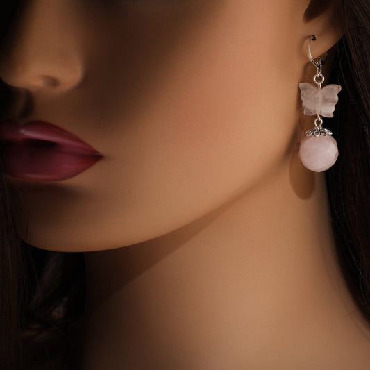 Natürlicher Madagaskar Rosenquarz handgefertigter Schmetterlings-Ohrhänger mit facettierten 14mm runden Perlen-Leverback-Ohrringen, Valentinstags-Liebesgeschenk