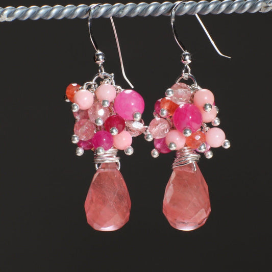 Erdbeerquarz Facettiert 12x16mm Tropfen, Cluster mit Rosa Koralle, Karneol Kirschquarz Verdrahteter 925 Sterling Silber Ohrring, Sommergeschenk