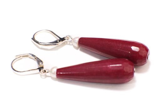 Rubin-Jade 20×40mm lange Träne mit Süßwasserknopfperle, Silber- oder Gold-Hebelohrringe, Geschenk für Sie