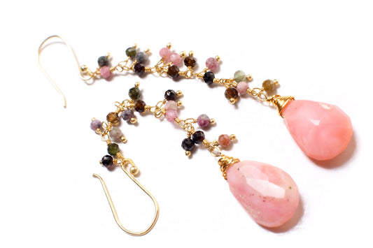 Tropfenförmige Ohrringe in Drahtumwicklung aus rosa peruanischem Opal, Clusterkette aus Wassermelonenturmalin in Ohrstecker aus vergoldetem Sterlingsilber