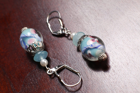 Ovale tschechische Glasperlen in Lampwork-Optik mit blau-rosa Blumen, Aquamarin-Rondell, rhodinierte Perlenkappen-Ohrringe in Leverback- oder langer Nieren-Ohrbügel