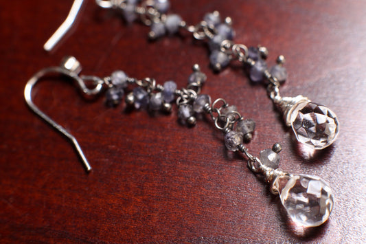 Echte Iolith-Cluster mit facettierten Clustern, oxidiertes Silber, natürlicher Bergkristall, 7 x 9 mm, mit Tropfendraht umwickelt, baumelnd in CZ-Rhodinierten Ohrhaken