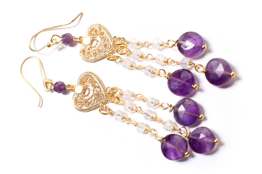 Natürlicher Amethyst baumelndes filigranes Kronleuchter-Herz, facettierte Opalit-Abstandshalter, drahtumwickelte Goldohrringe, handgefertigtes Geschenk für Sie,