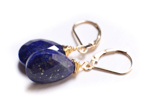 Lapislazuli-Ohrringe, natürlicher Lapis-Tropfen, 12 x 16 mm, drahtumwickelt, lange Träne, in 14 Karat Gold gefüllt oder 925 Sterling Silber, mit Leverback