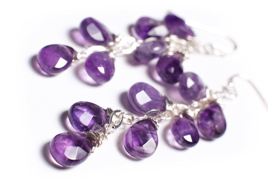 Natürliche brasilianische Amethyst Kaskaden Tropfen Ohrringe, 925 Sterling Silber, 7x9mm Draht gewickelt Tropfen Baumeln Ohrhaken, Minimalistisch, Geschenk für Sie