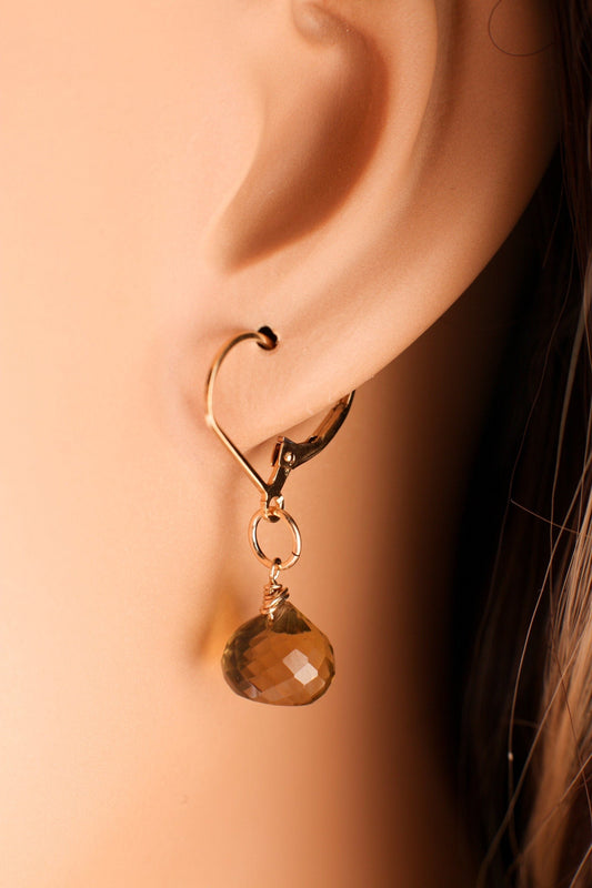 Whiskeyquarz 9x10mm Zwiebelform Drahtumwickelter Briolette-Ohrhänger mit 14K Gold gefülltem Leverback, Edelstein Handgemachte Ohrringe Geschenk