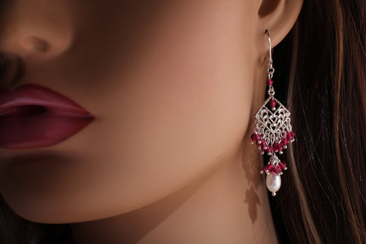 Rubinrosa Spinell Filigrane Kronleuchter Ohrringe in Rhodium Silber und 18K Gold Galvano galvanisierte Leverback Ohrringe, handgefertigtes Geschenk für Sie