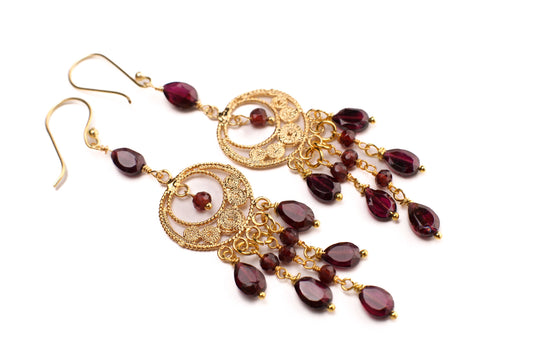 Echter Granat, baumelnder, drahtumwickelter ovaler Kronleuchter in 14 Karat Gold Vermeil-Ohrdraht, Geburtsstein für Januar, kostbares Geschenk für Sie