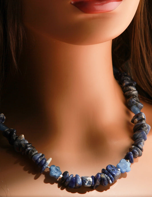 Sodalith-Rohnugget mit geschnitztem Vintage-Blumen-Edelstein, 19 Zoll große Halskette mit 2 Zoll langer Verlängerungskette