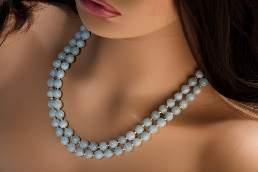 Aquamarin-Halskette mit 2 Reihen, echter Aquamarin, glatt, rund, 925er Sterlingsilber, Abstandshalter und Verschluss, natürlicher Edelstein, Geburtsstein für März, 18" plus 2" ext