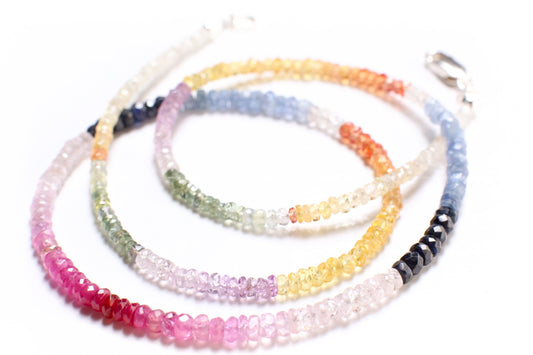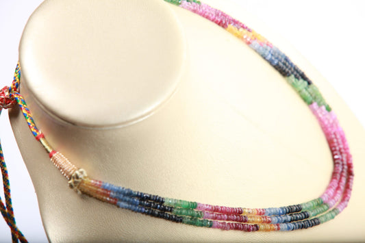 Echter Multi-Saphir, 3–4 mm, facettierter runder Edelstein, 3-reihige, verstellbare Halskette, 15 Zoll plus 9 Zoll verstellbarer Seidenfaden