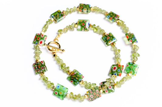 Natürlicher Peridot-Rohstein, getrommelter Nugget, 4 x 6–5 x 7 mm, Edelstein. Kissenförmiges Zwischenstück mit Millefiori-Blumenperle, 12 mm, Gold-Knebelverschluss-Halskette