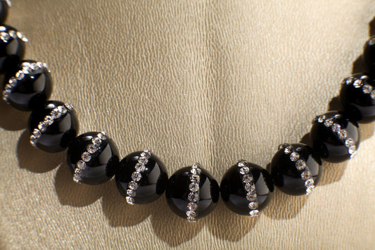 Halskette aus schwarzem Onyx mit 12 mm Strasssteinen und runden Onyxperlen mit Magnetkugelverschluss