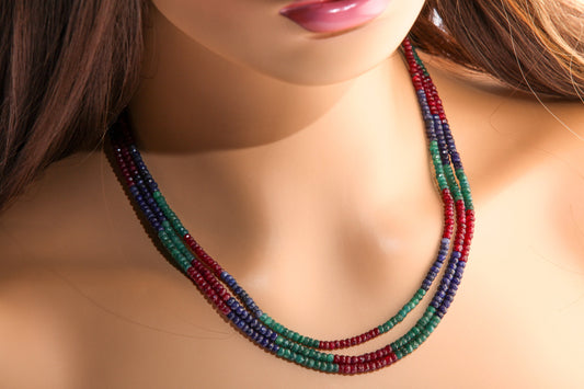 Halskette mit 3 Reihen, Rubin, Saphir, Smaragd, 4,5–5 mm, 17 Zoll plus 9 Zoll, verstellbare Fadenkette