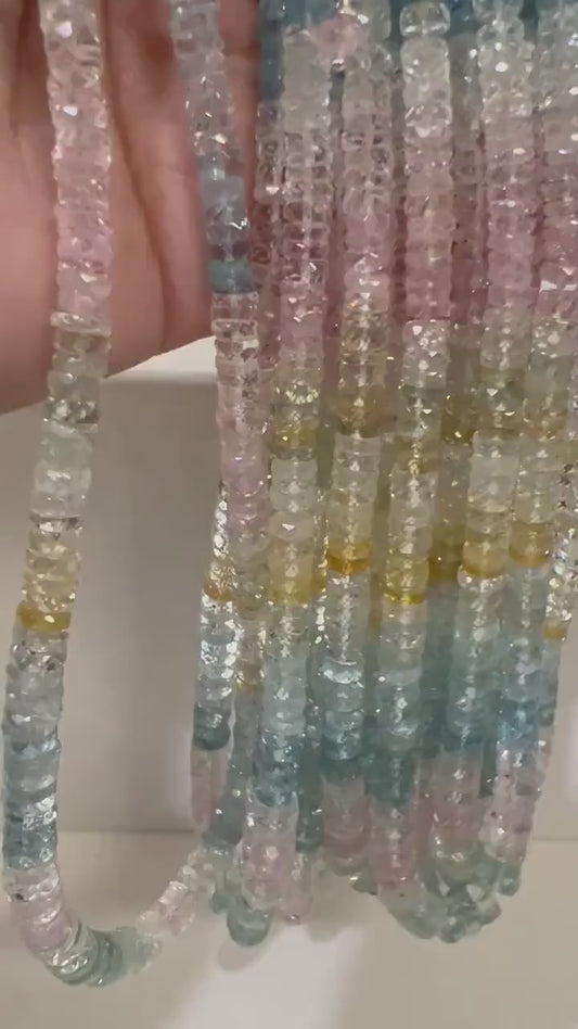 Natürliche Multi-Aquamarin-Halskette, Morganit 4–6 mm, mikrofacettierter Schliff, abgestufter Reifen, Heishe-Roundel, seltene, elegante Halskette aus AAA-Sterlingsilber