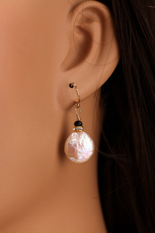 Natürliche Süßwasser-Münzperle, 13 mm. Pfirsichrosa, hochglänzende, baumelnde, drahtumwickelte, goldgefüllte oder Sterling-Silber-Ohrringe