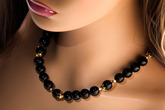 Schwarze Onyx-Rundperlen, 12 mm, mit Süßwasserperlen-Abstandshalterperlen, 18 Karat vergoldeter 20-Zoll-Halskette und 2-Zoll-Verlängerung