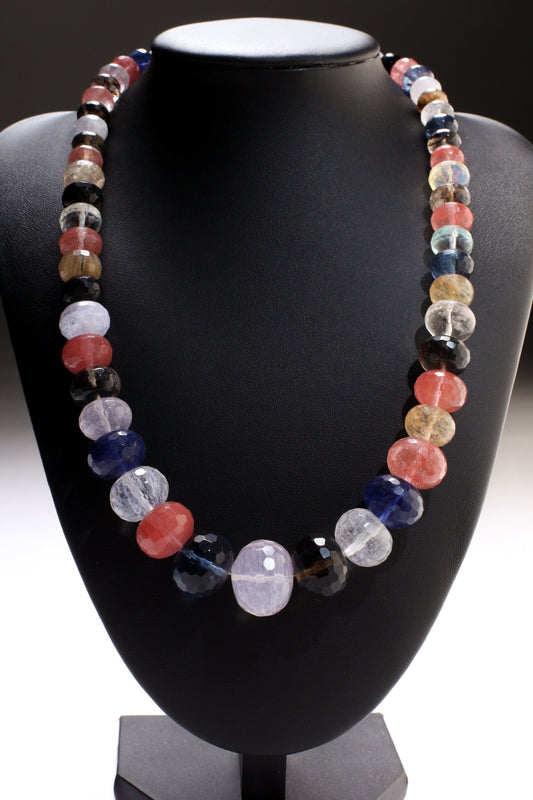 Halskette mit abgestuften Rondell-Anhängern aus mehreren Edelsteinen, Blaubeere, Erdbeere, Rutil, Ananas, Aquamarin, Rauch, Blau, Bergkristall, 50,8 cm lange Halskette