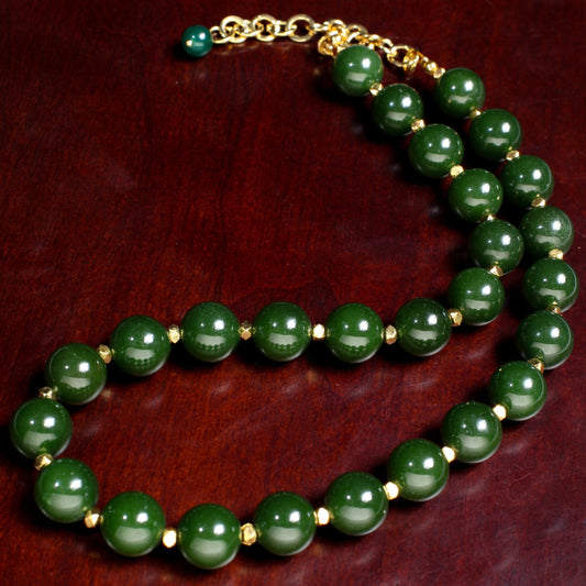 Kanadische Nephrit-Jade-Halskette, 12 mm, 18 Zoll, Gold, mit 3 Zoll Verlängerungskette. Hochwertige, glatte, polierte Jadeperle. Geschenk für Mama