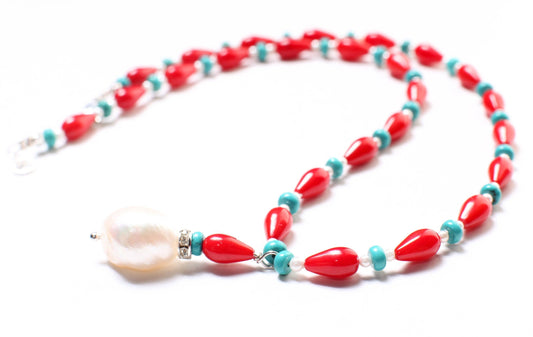 Echte AAA-Korallenträne aus rotem Bambus, 5 x 9 mm, mit türkisfarbenem 4 mm Rondell und Süßwasserperlen-Abstandshaltern, 925er Sterlingsilber-Halskette, 14–30 Zoll