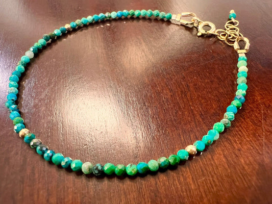 Natürliches Chrysokoll-Armband, 2 mm, mikrofacettiert, 14 Karat Gold gefüllt mit 1 Zoll langen Verlängerungen, ein Geschenk aus Edelsteinen.