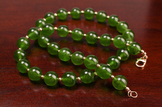 Echte grüne Jade, Nephrit, kanadische Jade, 10 mm rund, Gold, Halskette mit Goldfüllung, starker Magnetverschluss. Hochwertige Jade-Halskette, 40,6–86,4 cm