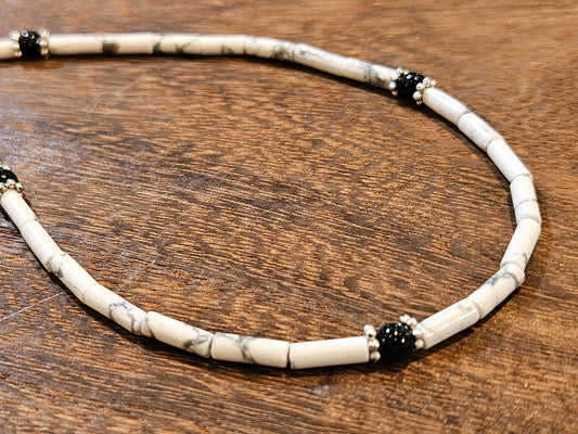 Natürliches weißes Howlith-Röhrchen, glatt, 4 x 13 mm, mit schwarzem Onyx, Silber-Abstandshalter im Bali-Stil, rhodiniertes Silber, Karabinerverschluss, Halskette für Männer und Frauen