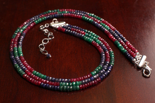 Halskette mit dreireihigem Rubin, Saphir und Smaragd, 4,5–5 mm, 43,2 cm, mit 7,6 cm langem rhodiniertem Karabinerverschluss, 315 Karat