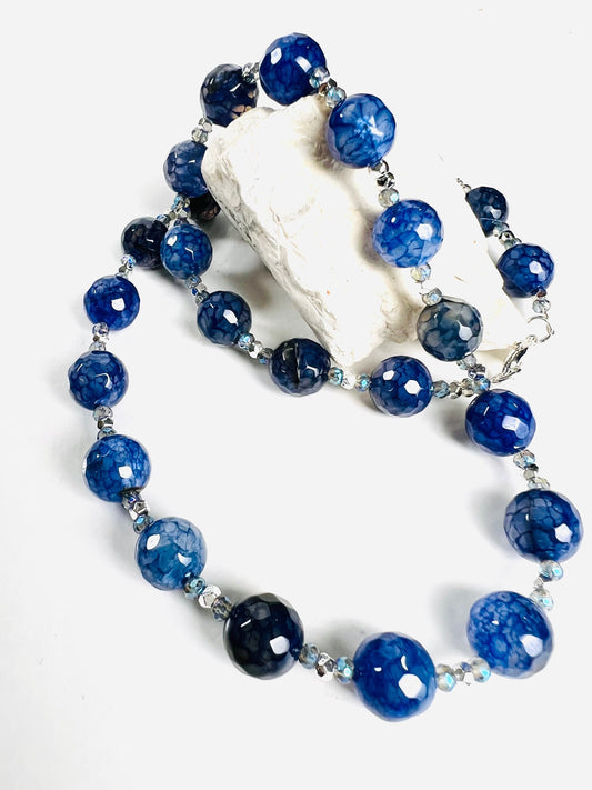 Halskette mit facettiertem Feuerachat, natürlichem blauen Saphir, 8 mm runde Perlen, Edelsteine, silberner Abstandshalter und Verschluss mit optionaler 2-Zoll-Verlängerung
