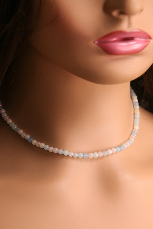 Morganit-Halskette, rund, 4,5 mm, Babyrosa/Blau für Mann und Frau, mit silbernem Karabinerverschluss, Strand-/Boho-/Sommergeschenk