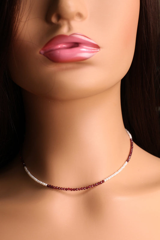 Merlot Roter Granat 2,5–3 mm facettiert und Süßwasserperle Choker Layering Halskette, 925 Sterling Silber, Januar Geburtsstein, Frauen Geschenk