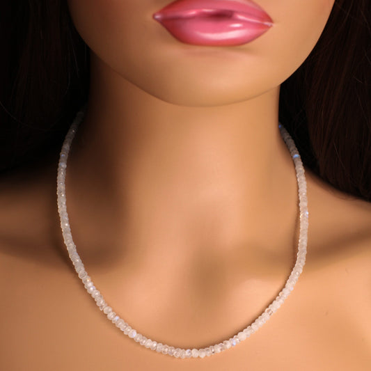 Halskette aus natürlichem Regenbogen-Mondstein, 4–4,5 mm, facettierte Rondell-Halskette aus 925er Sterlingsilber, 12 mm Knebelverschluss, Heilung, Energie, kostbares Geschenk