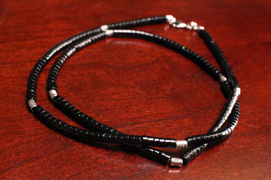 Natürlicher schwarzer Onyx, glatte Heishi-Unterlegscheibe, 4 mm, silberne Abstandshalter im Bali-Stil, rhodinierte Silber-Halskette mit Karabinerverschluss für Männer und Frauen