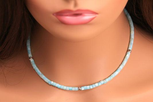 Natürliche Perlmutt Babyblau Heishi 4mm Unterlegscheibe Perle Bali Stil Silber Spacer Rhodium Silber Karabinerverschluss Halskette für Männer und Frauen