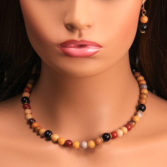 Mookait glatt rund 8mm mit schwarzem Onyx Akzent Bali Stil Spacer Gold Halskette und Ohrringe Set