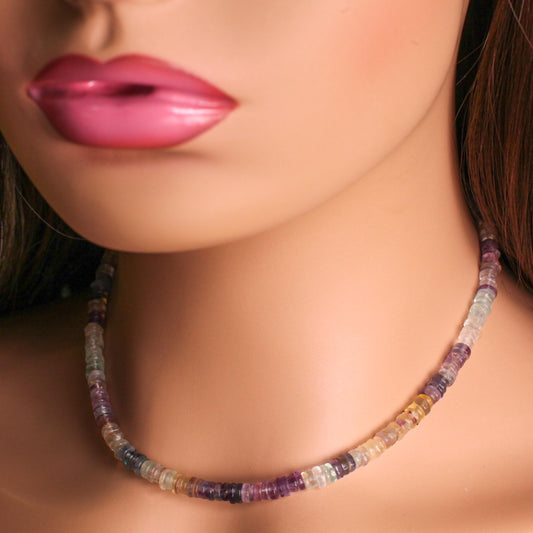 Natürliches Fluorit-Heishi-Rundstück 4–5 mm, wunderschöne violett-gelb schattierte Halskette für Mann und Frau mit silbernem Karabinerverschluss, Strandgeschenk