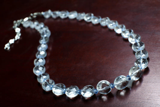Aquamarinquarz, facettiert, 10 mm, Münzform, akzentuiert mit Kristall-Abstandsperlen, 17,5 Zoll große Halskette mit 3 Zoll großer Verlängerungskette